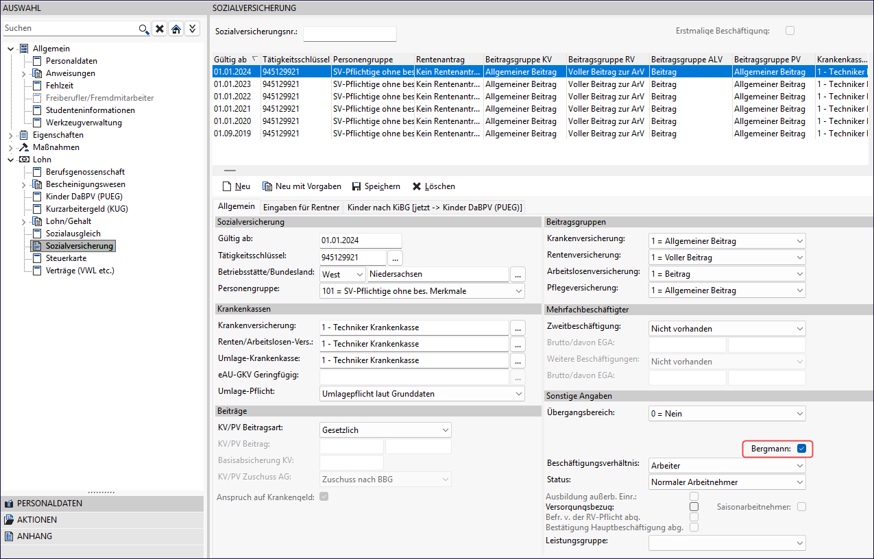 Sollten Sie dennoch einen Mitarbeiter als Bergmann abrechnen wollen, können Sie in der Sozialversicherungsmaske unter „Lohn → Sozialversicherung" den Haken „Bergmann“ setzen.