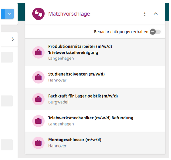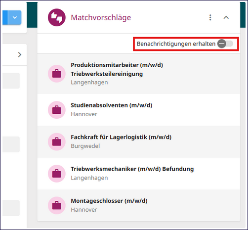 Sollten unter den vorhandenen Matchvorschlägen keine passenden Treffer sein, können Sie über den Schieberegler „Benachrichtigungen erhalten“ festlegen, dass Sie automatisch informiert werden, sobald neue potenzielle Matches im Cockpit eingehen.