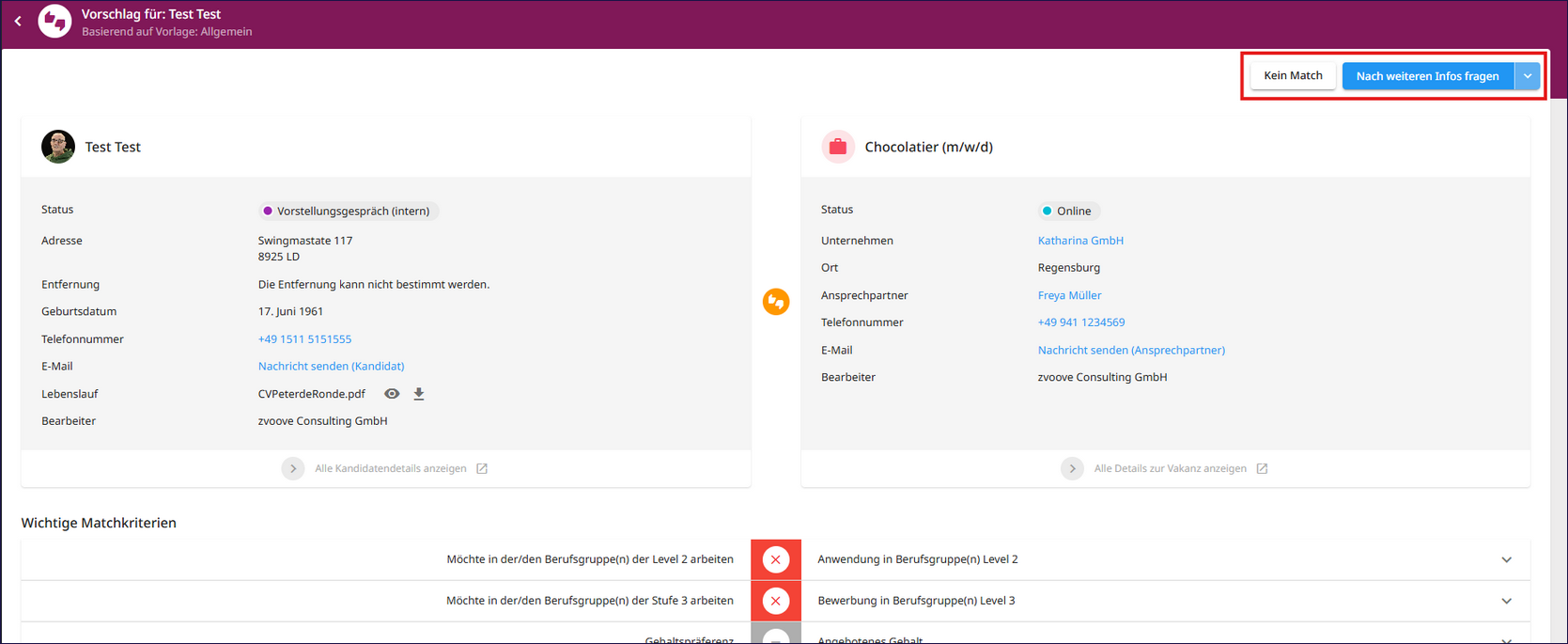 Weiter unten finden Sie – wie gewohnt – die Gegenüberstellung von Kandidat und Vakanz entlang der relevanten Matchkriterien. Dies erleichtert die Entscheidung über den Umgang mit dem jeweiligen Vorschlag.