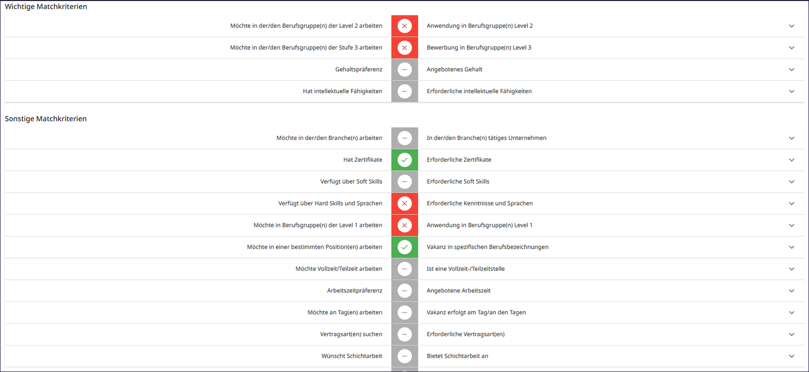 Welche Kriterien in die Bewertung einfließen, hängt von der jeweils hinterlegten Matchvorlage ab. Ist keine spezifische Vorlage ausgewählt, verwendet das System automatisch die Standardvorlage „Default“.