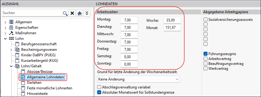 Die UV-Stunden werden bei Gehaltsempfängern anhand der hinterlegten Stunden im Personalstamm unter „Lohn → Lohn/Gehalt → Allgemeine Lohndaten“ ermittelt.