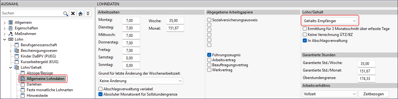 Des Weiteren ist die Einstellung „Lohnempfänger“ bzw. „Gehaltsempfänger“ für die Stundenermittlung verantwortlich, welche Sie unter „Lohn → Lohn/Gehalt → Allgemeine Lohndaten“ finden.