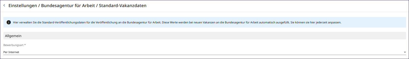 Der Pfad zur Einstellung: Verwaltung → Einstellungen → Setup → Bundesagentur für Arbeit → Standard-Vakanzdaten