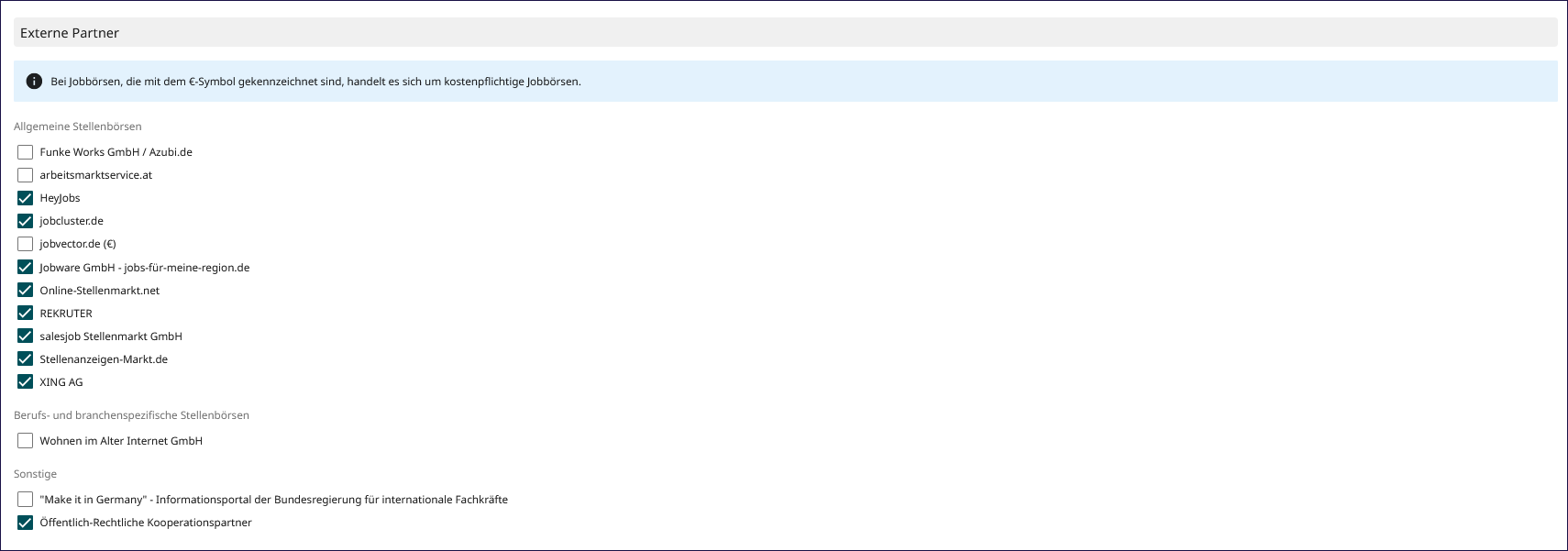 - Standard-Jobbörsen auswählen, auf denen Stellenangebote automatisch veröffentlicht werden.