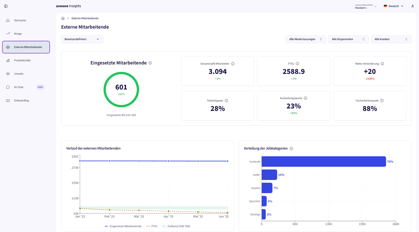 Dieses Modul betrachtet Struktur und Entwicklung der externen Belegschaft, z.B. aktive Mitarbeitende, FTE, Nettoveränderung, Auslastung, Teilzeitquote und Frühfluktuation. Es unterstützt dabei, Kapazität und Wachstum steuerbar zu machen.