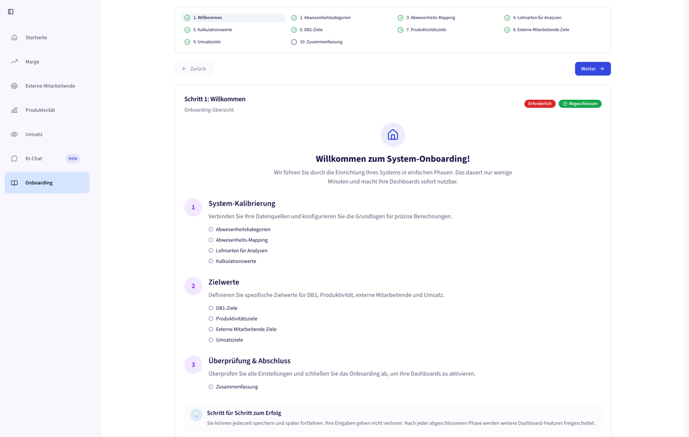 Besonders wichtig sind saubere Stamm- und Bewegungsdaten: korrekte Zuordnung von Kunden und Aufträgen, konsistente Zeitarten sowie nachvollziehbare Lohn- und Kostenarten. Unsaubere Zuordnungen können zu Abweichungen in DB1, Produktivität oder Fehlzeiten führen. Diese geben Sie im Onboarding und können jederzeit aktualisiert werden.