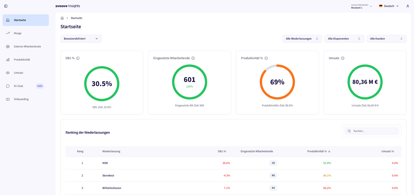 Die Startseite fasst die wichtigsten Kennzahlen zusammen (z.B. DB1, Umsatz, Produktivität, externe Mitarbeitende) und zeigt Abweichungen zum Ziel. Zusätzlich unterstützt ein Niederlassungs-Ranking dabei, schnell positive und negative Ausreißer zu erkennen.