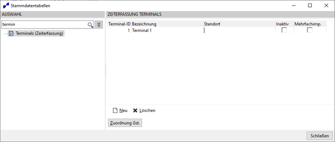 Die Terminals müssen in der Stammdatentabelle im zvoove (für Personaldienstleister) unter “Datei → Stammdaten → Stammdatentabellen → Terminals (Zeiterfassung)” angelegt werden.