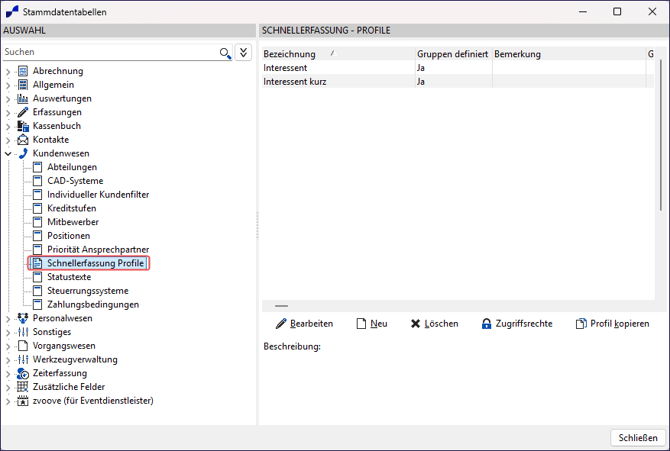Zum Anlegen eines Schnellerfassungsprofils öffnen Sie in zvoove PDL den Menüpfad: Datei → Stammdaten → Stammdatentabellen → Kundenwesen → Schnellerfassung Profile