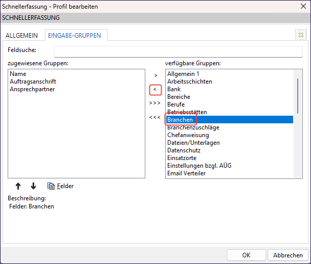 Durch Anklicken einer Gruppe wird im unteren Fensterbereich eine Beschreibung der enthaltenen Gruppenfelder angezeigt.