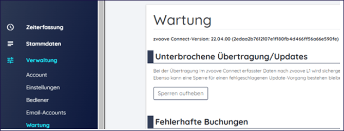 Loggen Sie sich als SYS in Ihr zvoove Connect ein und navigieren Sie zu "Verwaltung → Wartung".