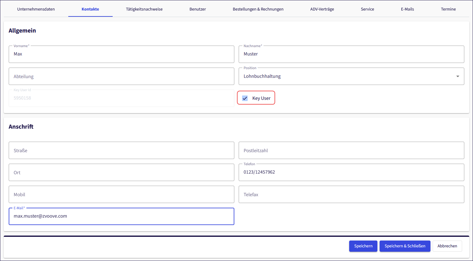 Um nun einen weiteren Kontakt als Key User zu hinterlegen, klicken Sie den entsprechenden Kontakt an, setzen den Haken bei “Key User” und speichern Ihre Eingabe.