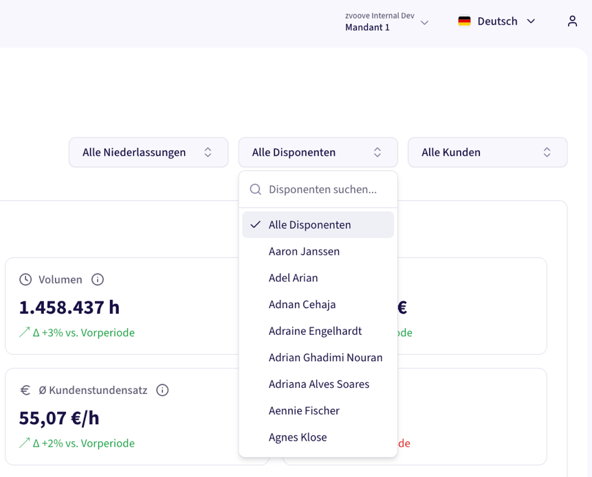 Setzen Sie den Zeitfilter zurück und wählen Sie rechts oben „Alle Standorte", „Alle Disponenten" und „Alle Kunden" aus. Ein guter Check ist, die Filter schrittweise neu zu setzen, wenn Ergebnisse unerwartet sind.