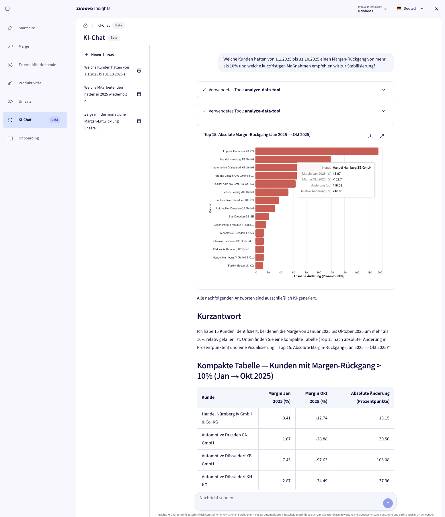 Geben Sie immer Kontext mit: Zeitraum, Standort und die gewünschte Kennzahl (z.B. DB1, Umsatz, Produktivität). Wenn es um Details geht, ergänzen Sie Kunde oder Auftrag. Je konkreter die Frage, desto präziser die Antwort.