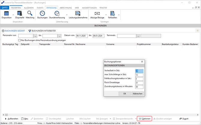 Die Stunden finden Sie im zvoove (für Personaldienstleister) unter "Erfassung → Buchungen". Sollten diese nicht tagesaktuell angezeigt werden, müssen Sie bitte die Vorlaufzeit im zvoove (für Personaldienstleister) anpassen. Diese finden Sie im selbigen Register unter "Optionen".